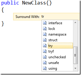 Есть также "окружающие" сниппеты для выделенного блока кода, которые можно вызвать по правой кнопке или комбинации Ctrl+K, Ctrl+S. Для конструкций вроде try-finally, которые часто вводятся уже после написания кода, очень удобно.